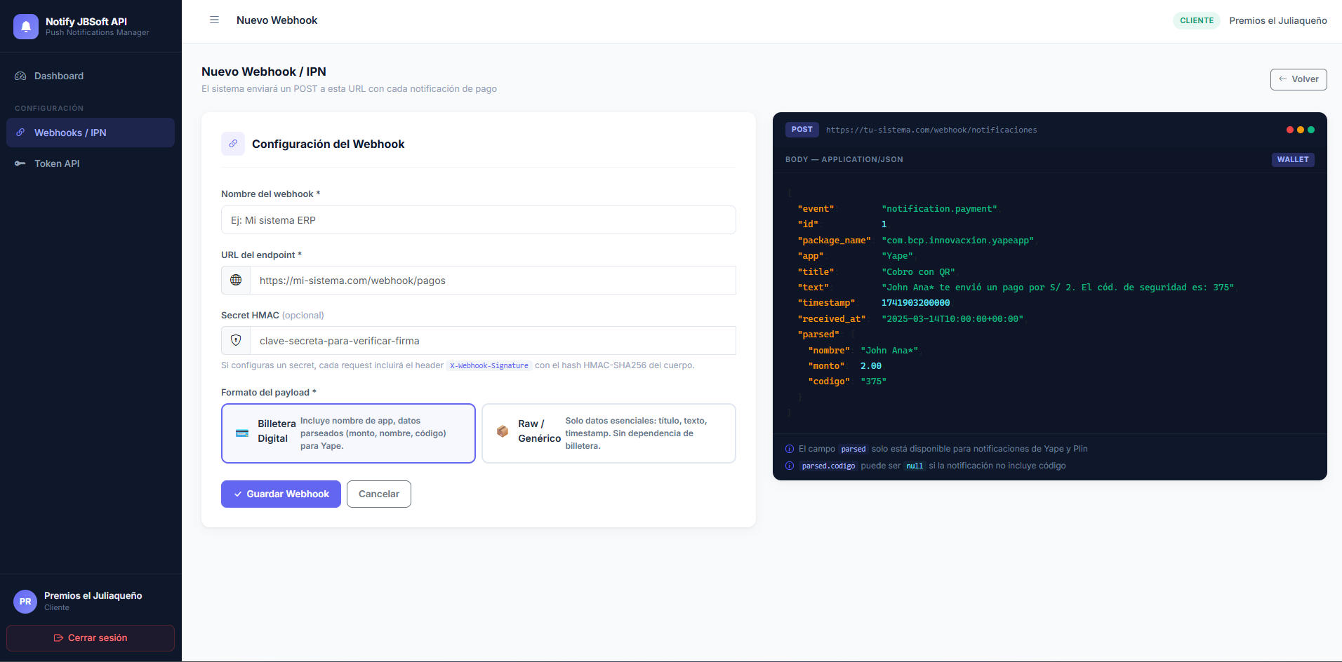 | Formato de payload | wallet (datos parseados) o raw (datos crudos) |